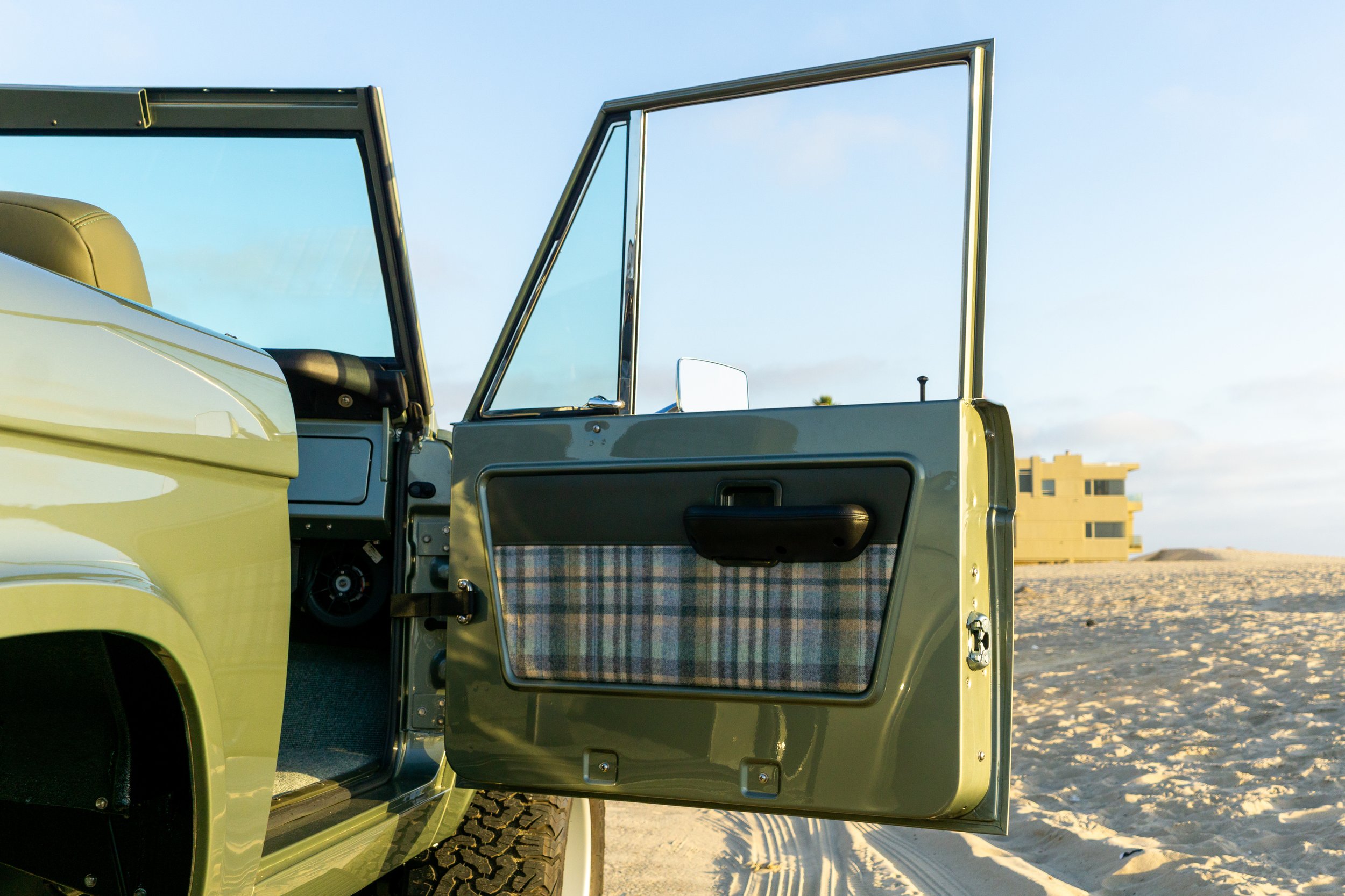 • California Sage with custom green leather interior and wool heritage plaid.